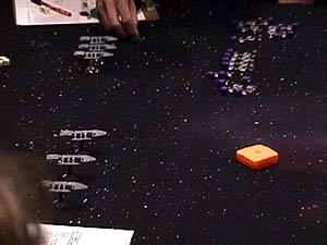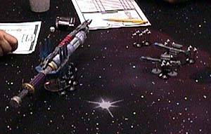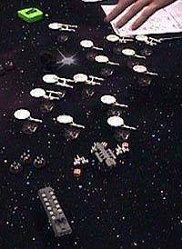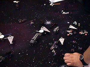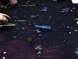 Mike Miserendino ran a Battlestar Galactica based Full Thrust game. There is a big dogfight on the left and a line of Battlestars on the right