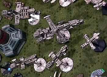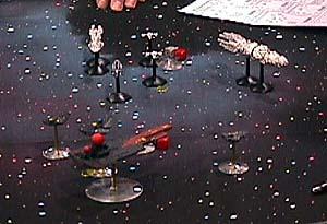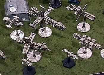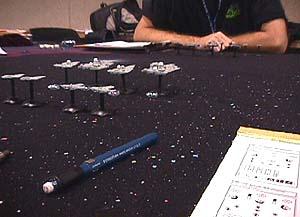 Above is a shot of Schoon's FSE minis vs a fleet of Star Frontiers Federation minis. He got a bit excited when he saw the camera and had to wave to everyone. |