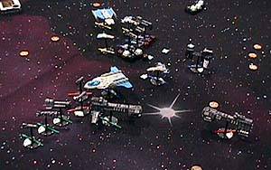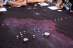 A shot of the Cylons attacking during Mike Miserendino's Battlestar Galactica Full Thrust game