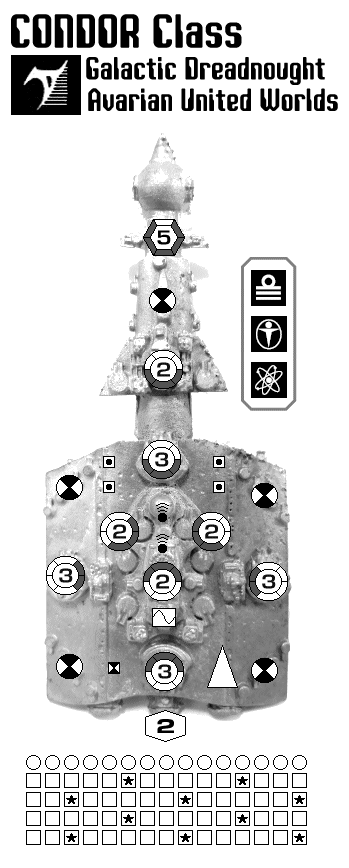 battlecruiser. Recent construction of dreadnoughts may indicate a shift in their thinking. The Avarians fly in a box formation with the undersides facing in. With their powerful armament and engines protected by the heavily armored sloping hull they are nearly invulnerable to attack."