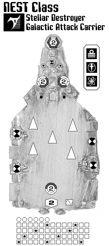 Mass 180 Cost 647/559 (+ fighters) Ave Hull 54 (14/14/13/13) 8 Points Armour Thrust 2 (Adv Grav Drives) FTL 2 Fire Controls 4 PDS 1 ADFC Level 2 Screens 4 Class 2 Beam Batteries (F/FP/FS, F/FP/AP, F/FS/AS, A/AP/AS) 1 Class 2 K-gun (F) 5 Fighter bays