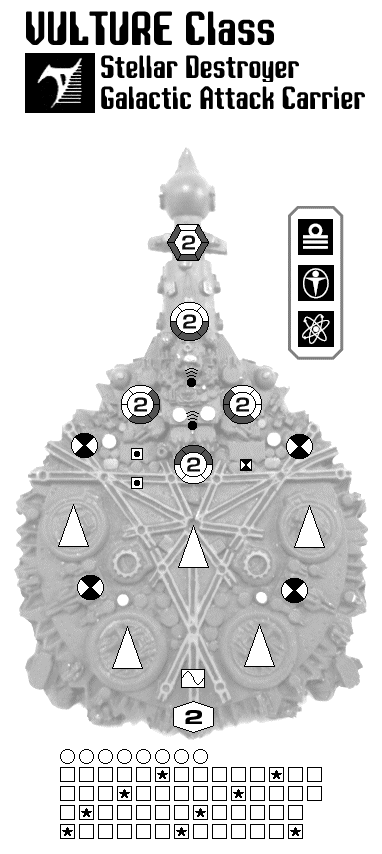 Mass 200 Cost 722/869 (+ fighters) Ave Hull 60 (15/15/15/15) 15 Points Armour Thrust 2 (Adv Grav Drives) 4 Fire Cons 5 PDS 1 ADFC Level 2 Screens 4 Class 2 Beam Batteries (F/FP/FS, F/FP/AP, F/FS/AS, A/AP/AS) 4 Class 3 Beam Batteries (F/FP/FS, A/AP/AS, F/FP/AP/A, F/FS/AS/A) 1 Class 5 K-gun (F) 1 Fighter bay